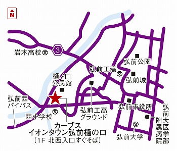 イオンタウン弘前樋の口バス停からイオンタウン弘前樋の口内を北西入口に向かい徒歩約2分。SHOO-LA-RUEさん隣