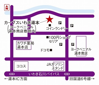 直進するとヨークベニマル湯本南店さんやドコモさんセリアさんがあります。カーブスはコインランドリーと併設しております。