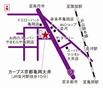 京都市方面からの場合9号線並河の交差点を越え1分程進んだ左手にあります
