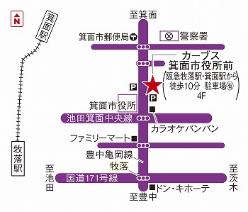箕面市役所を箕面駅方面に進むと右手にパン屋さんが入ってるビルがあり、そのビルの4階です。