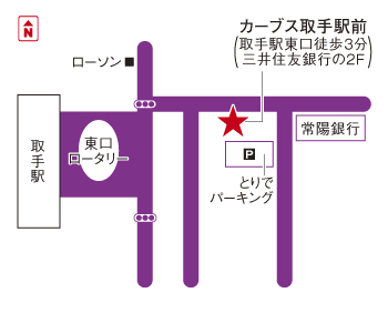 取手駅東口改札を出て左手に進み、ローソンさんが見えたら右方向へ直進、横断歩道を2回渡ります。道沿いに三井住友銀行さんが見えたらその横の階段を上がるとカーブス取手駅前店です。(ナガタニビル2階)お車の方はビル裏手のとりでパーキングプラザさんに停めていただけます。バイクや自転車の方も駐輪場がありますのでご安心ください。