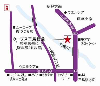 三島北口より車で5分。長泉から三島の道路が開通され、長泉方面の方も通いやすくなりました。日大三島の通りを北へ進み(裾野方面)約1キロの所にお店があります。お店の裏には広い駐車スペースも完備! -