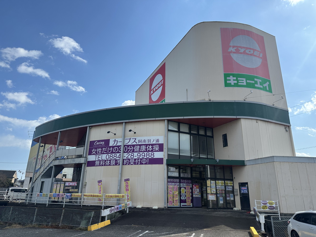 キョーエイ羽ノ浦店さんの向い、白い外観の建物の1階がカーブス阿南羽ノ浦店です。