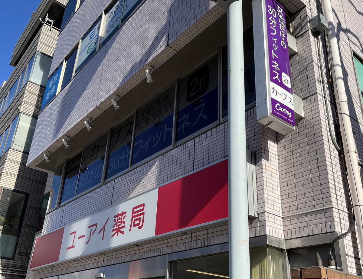 東西線早稲田駅前3b出口を出て右へ、早稲田高校・中学校さんの正門のお隣のビル。一階がユーアイ薬局さんのビルの2階です。