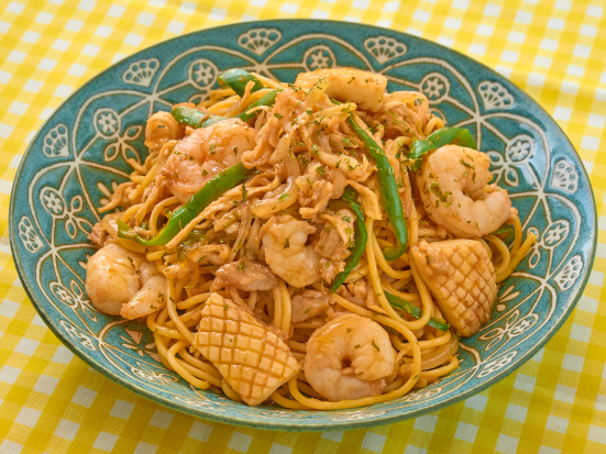 ➋フライパンにオリーブオイルを熱し、ピーマンと玉ねぎ、シーフードミックスを炒める。切り干し大根、ツナを加えてさっと炒め、A を加えて炒め合わせる。