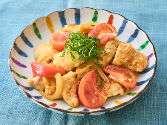 ➌鶏肉に火が通ったら火を止め、玉ねぎとトマトを加えてひと混ぜし、ぽん酢を加えてあえる。器に盛り、大葉をのせる。