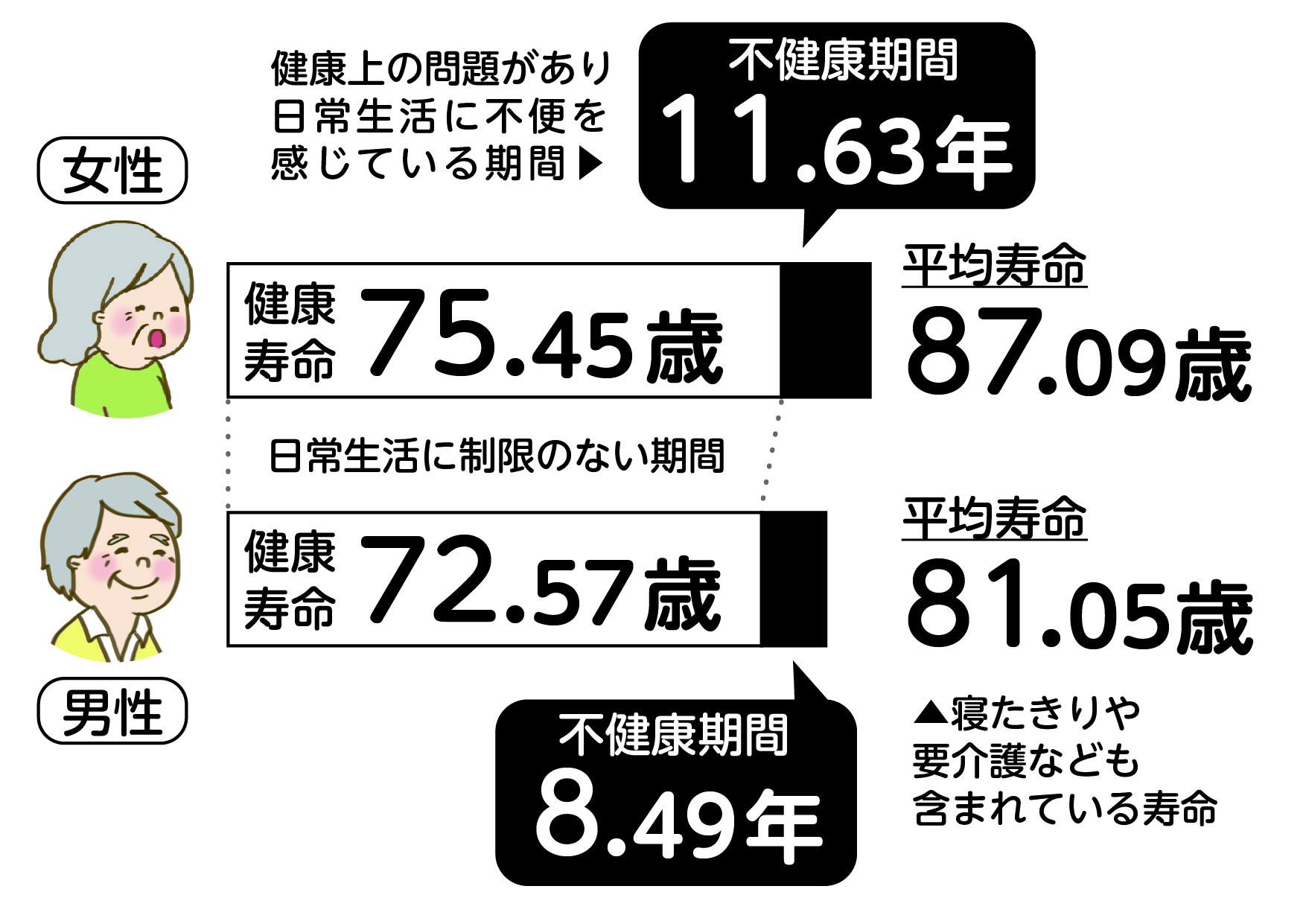 令和4年の平均寿命(0歳の平均余命)は、男性が81.05年、女性が87.09年でした。それに対し、健康寿命(健康上の問題で日常生活が制限されることなく、自立して生活できる期間)は、男性が72.57年、女性が75.45年となっています。その年数の差が「不健康期間」で、男性は8.49年、女性は11.63年、介護や医療が必要な状態で過ごしていることになります。