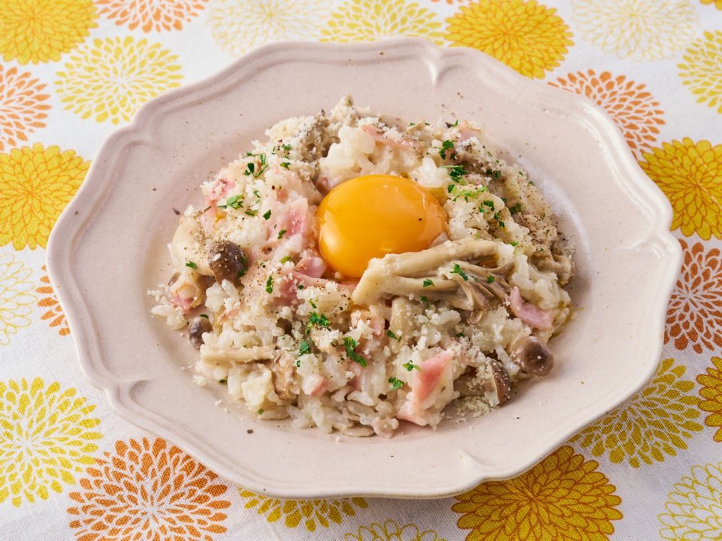 ベーコンときのこのカルボナーラリゾットレシピ【管理栄養士監修】