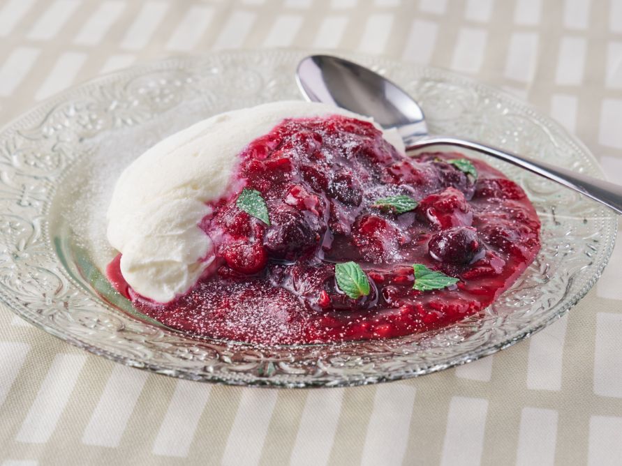 ➌器に➊を盛り、➋をかけて、お好みでミントを飾り、粉砂糖をふる。
