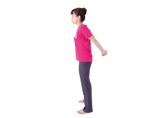 足を肩幅に開き、背中の後ろで手を組み、腕を伸ばします。