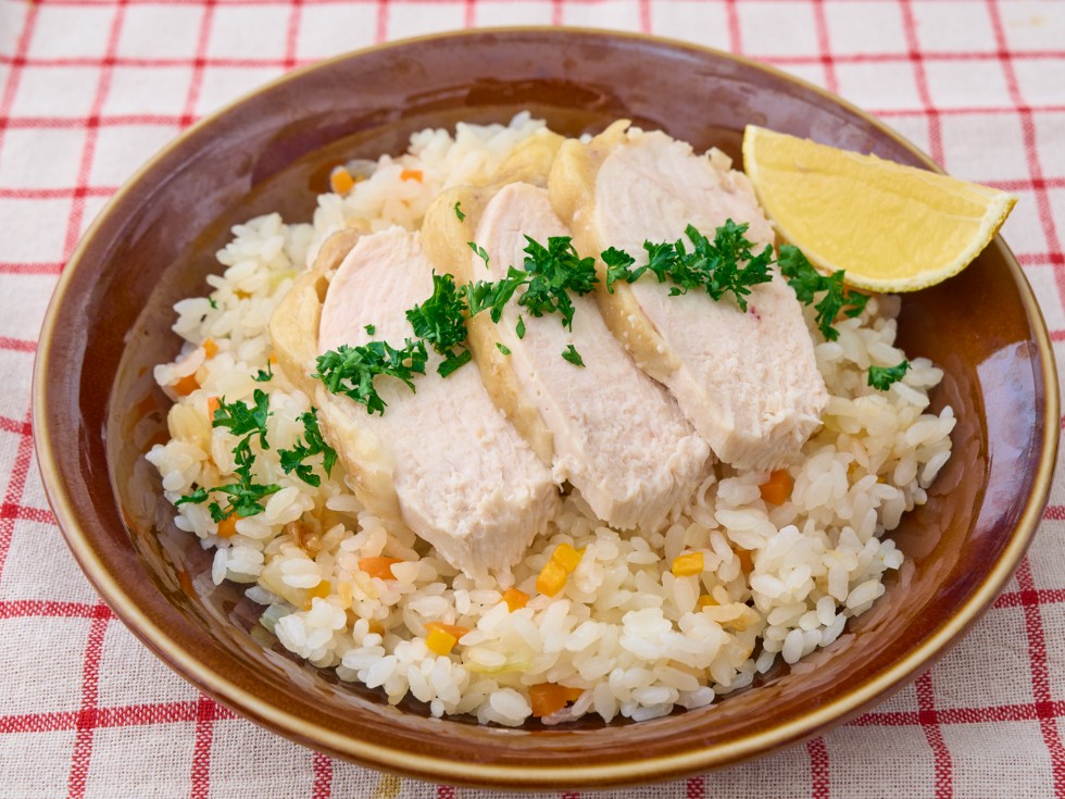 ➌器にご飯を盛り付け、カットした鶏肉をのせる。お好みでパセリ、レモンを飾る。