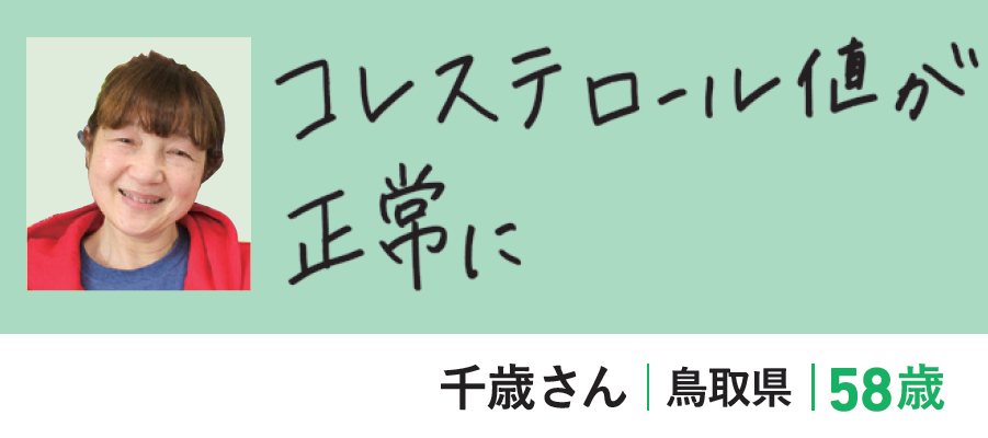 「年々、悪玉コレステロール(LDL)値が上がり、健診で149になり、『このままでは食事療法が必要』と言われてしまいました。悩んでいたとき、友人に誘われてカーブスへ。すると、半年でコレステロール値が下がり、つぎの健診では116に。それからずっと正常値を維持しています。」