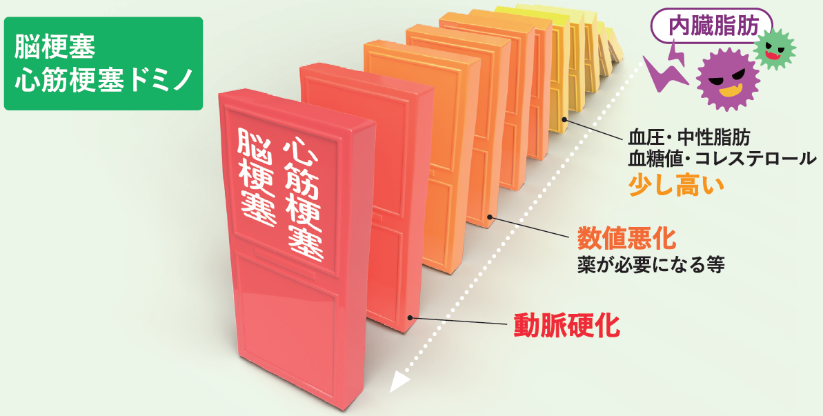 高血圧、高コレステロール(脂質異常)、高血糖…。それらは、血管を細く硬く、詰まらせやすくし、心筋梗塞や脳梗塞がいつ起こっても問題ない状態を引き起こします。その原因は「ぽっこりお腹」、つまり内臓脂肪です。