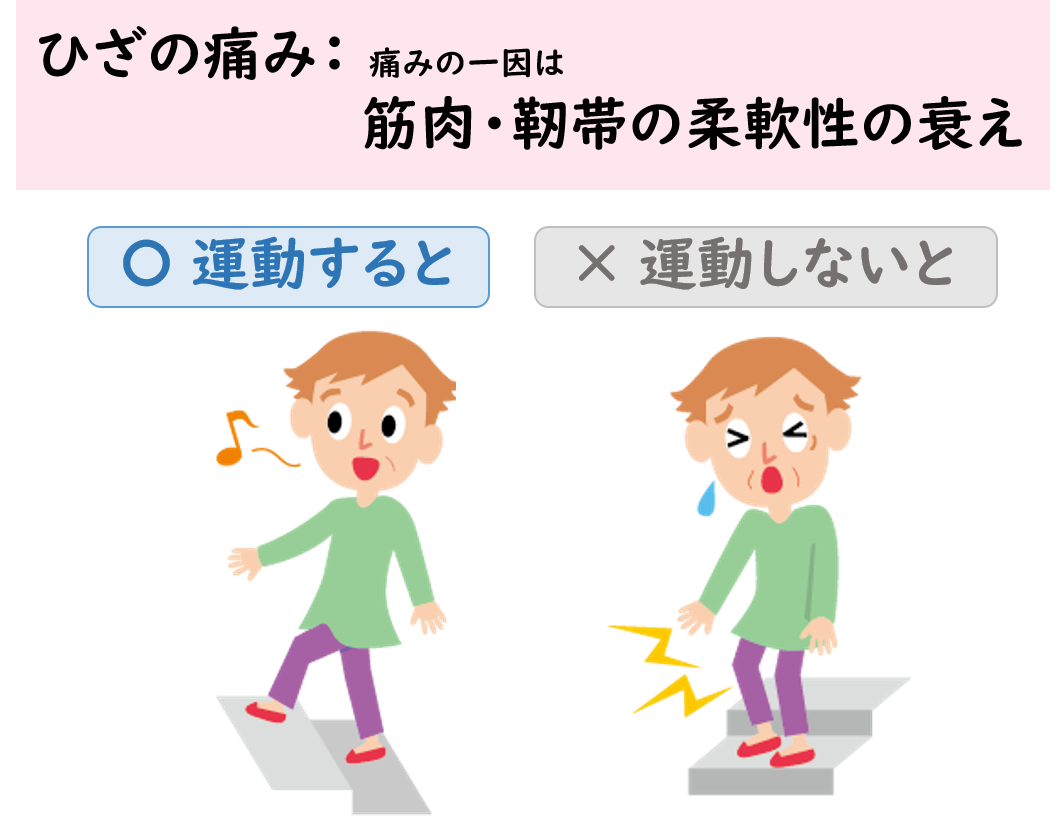 たとえば、ひざの痛みのある患者さんが、痛いからといってずっと安静にしていると、そのぶん筋力が落ちてしまいます。一度落ちた筋力をもとに戻すには、休んでいた期間以上の時間が必要になります。