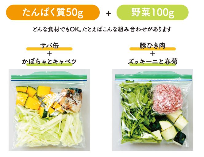 そこで、私が実践している、たんぱく食材50gと野菜100g(1人分)をひとまとめにした自家製冷凍パックづくりをご紹介しましょう。