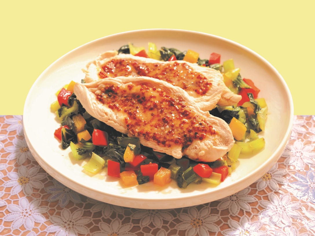油を使わず茹でただけのささみも、粒マスタードの酸味、はちみつの甘味、塩こうじの塩味と複数の味が感じられるソースで、おいしく食べられますよ。
