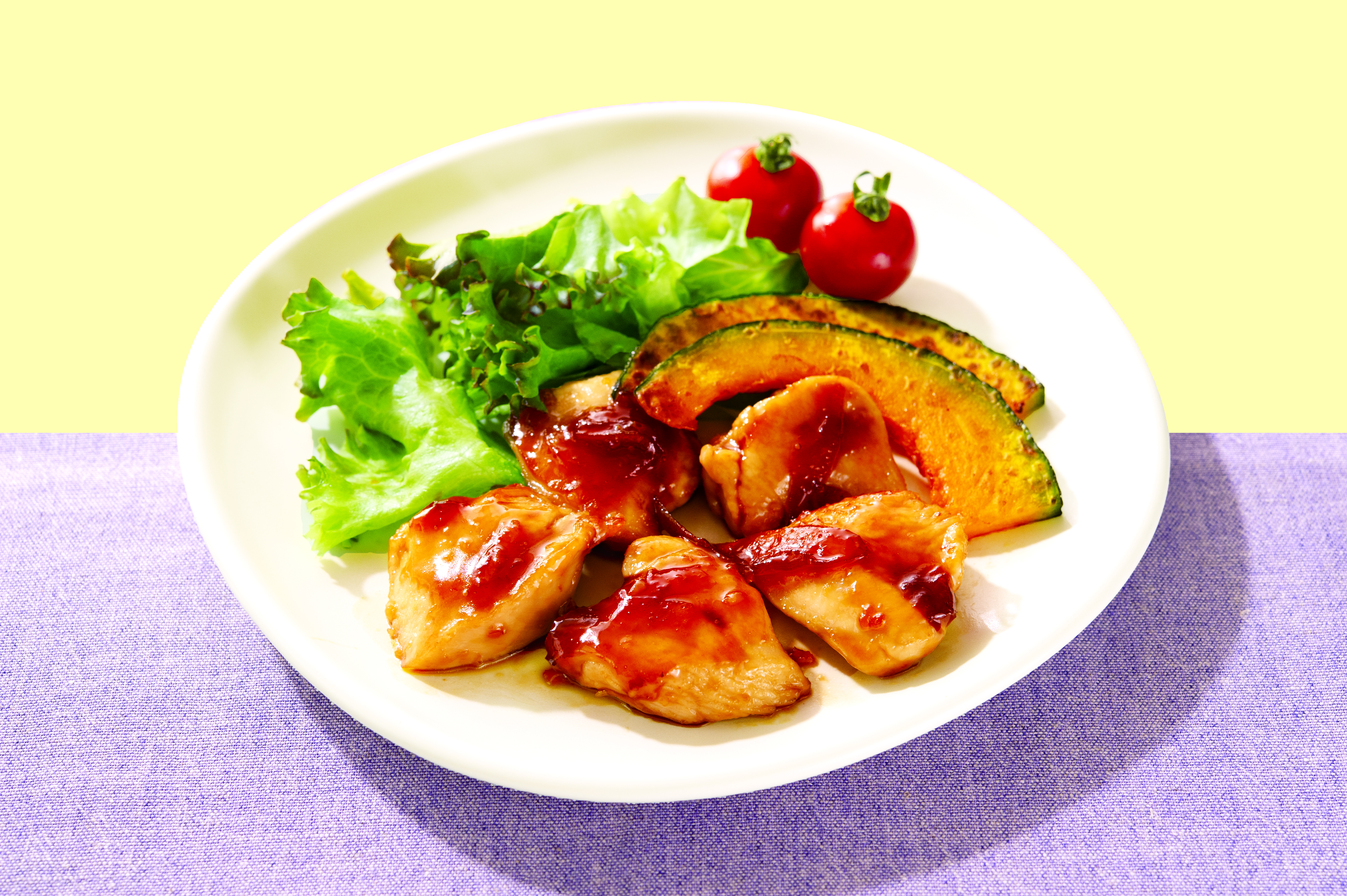 ➌かぼちゃを取り出し、[A]を入れて煮絡める。器に肉とかぼちゃを盛り付け、レタスとミニトマトを添える。
