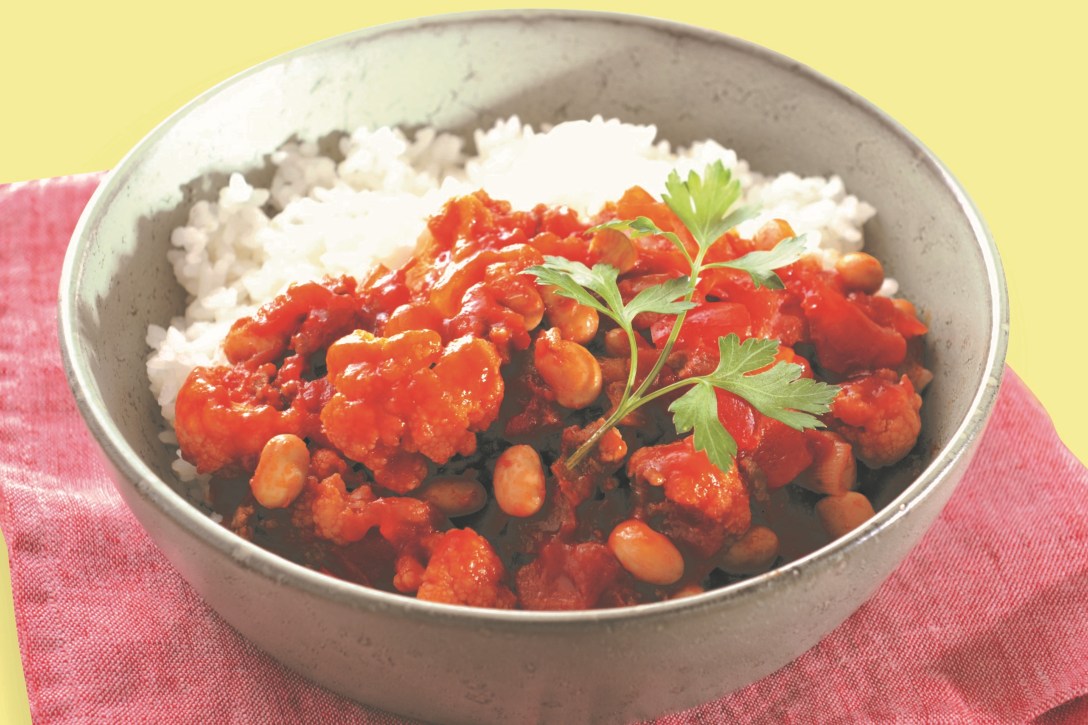 ➊フライパンにオリーブオイルとにんにくを入れて熱し、玉ねぎ、ひき肉を炒める。肉の色が変わったらパプリカ、カリフラワーを入れてさらに炒める。