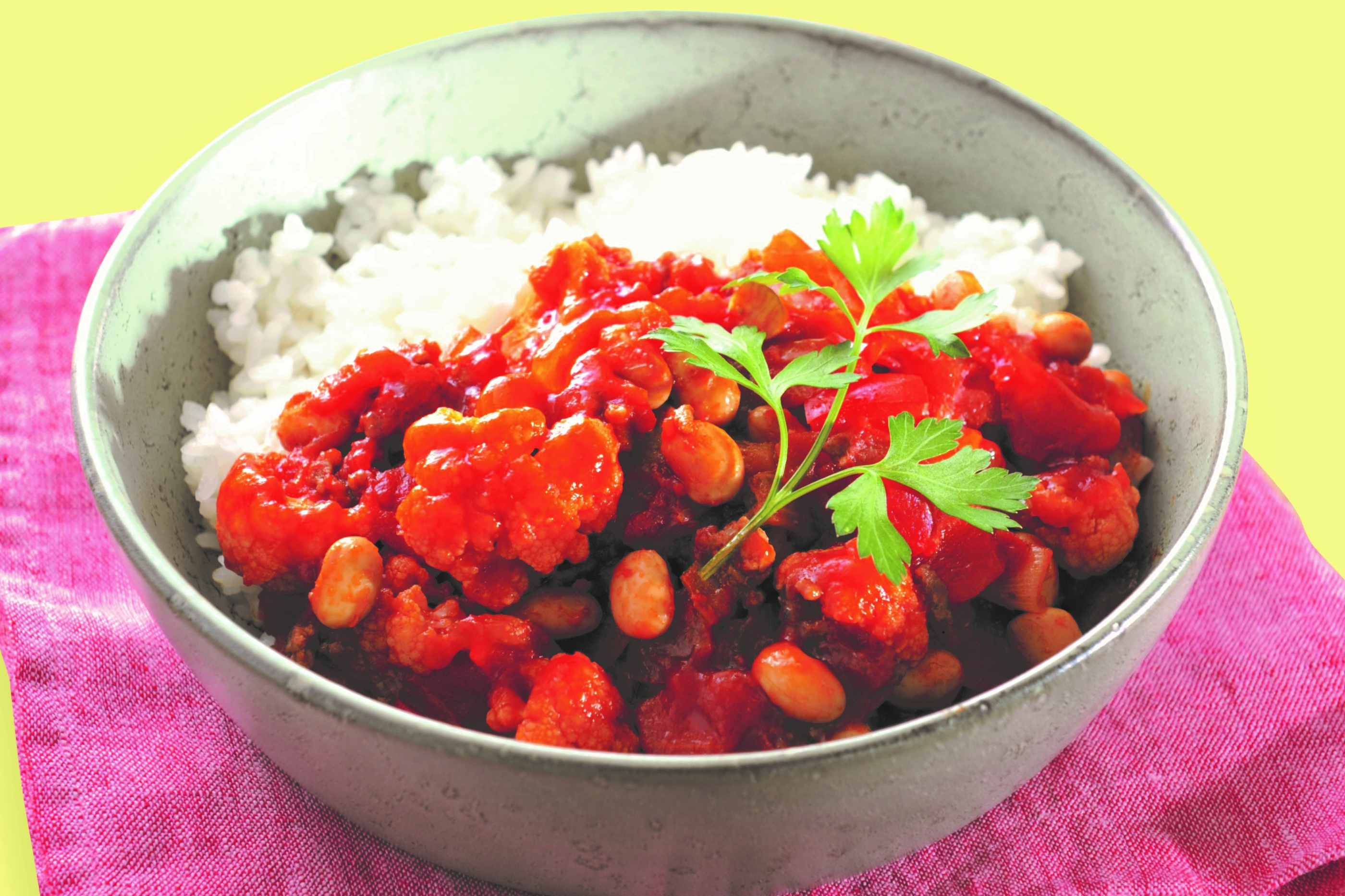 ➊フライパンにオリーブオイルとにんにくを入れて熱し、玉ねぎ、ひき肉を炒める。肉の色が変わったらパプリカ、カリフラワーを入れてさらに炒める。