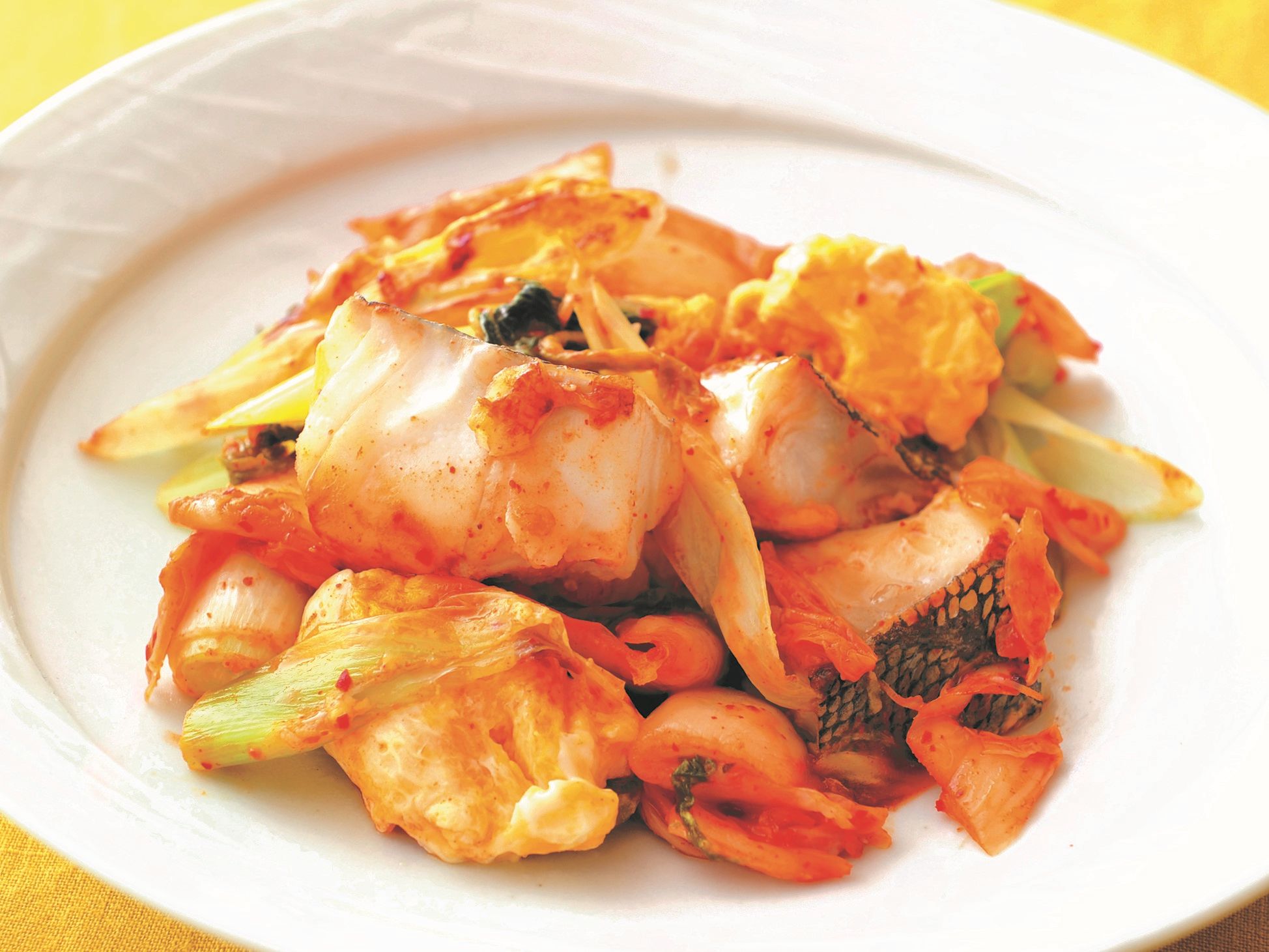 ➍キムチを加え全体に火が通ったら➋のタラを戻し入れ、崩さないように炒め、鍋はだからしょうゆを回しかけ、全体になじませる。
