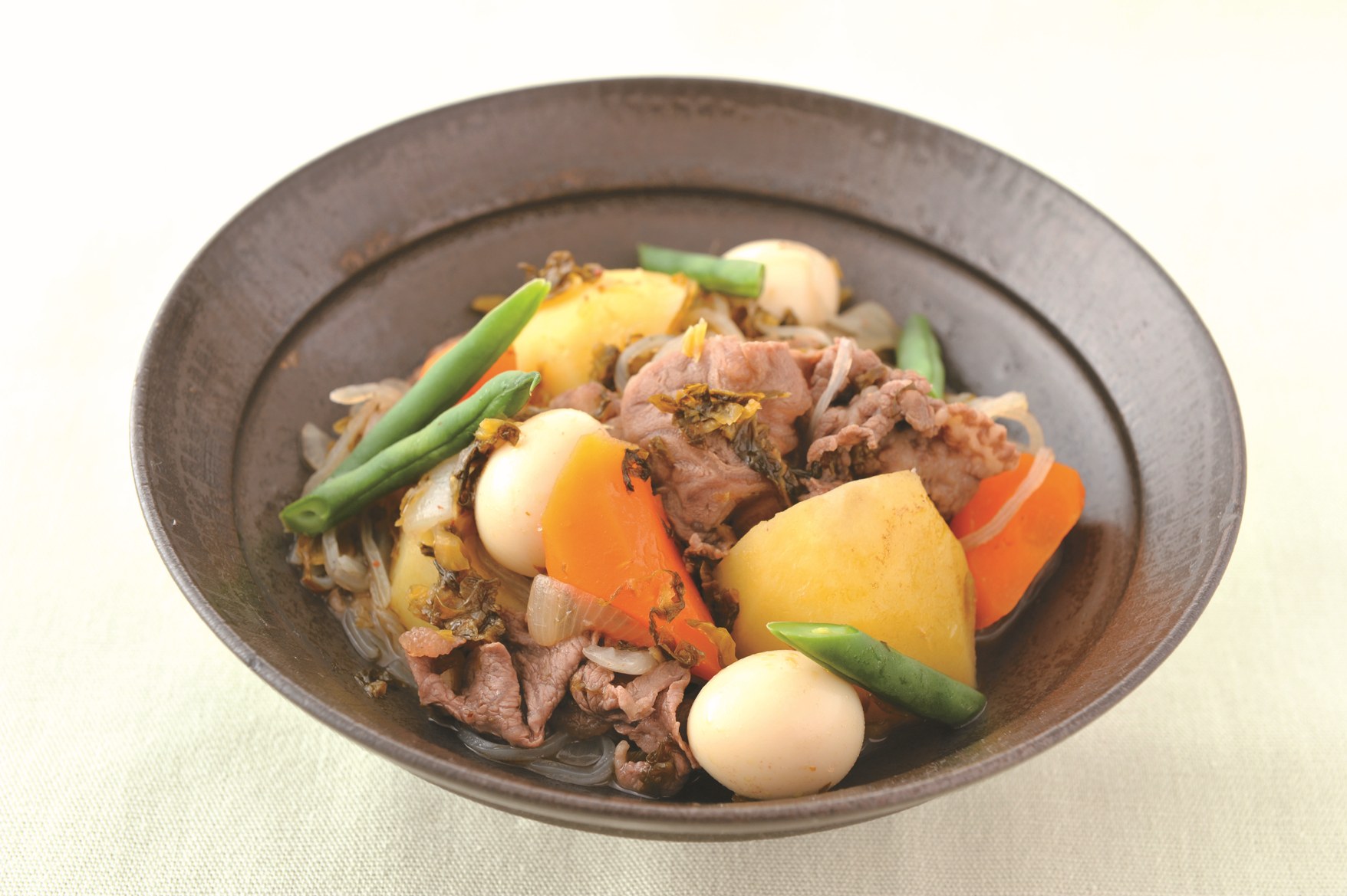 ➋鍋に[A]を入れて中火で熱し、ひと煮立ちしたら➊、うずらの卵、高菜を加え、沸騰したらあくをとる。ときどき煮汁をかけながら、じゃがいもがやわらかくなるまで7~8分加熱する。