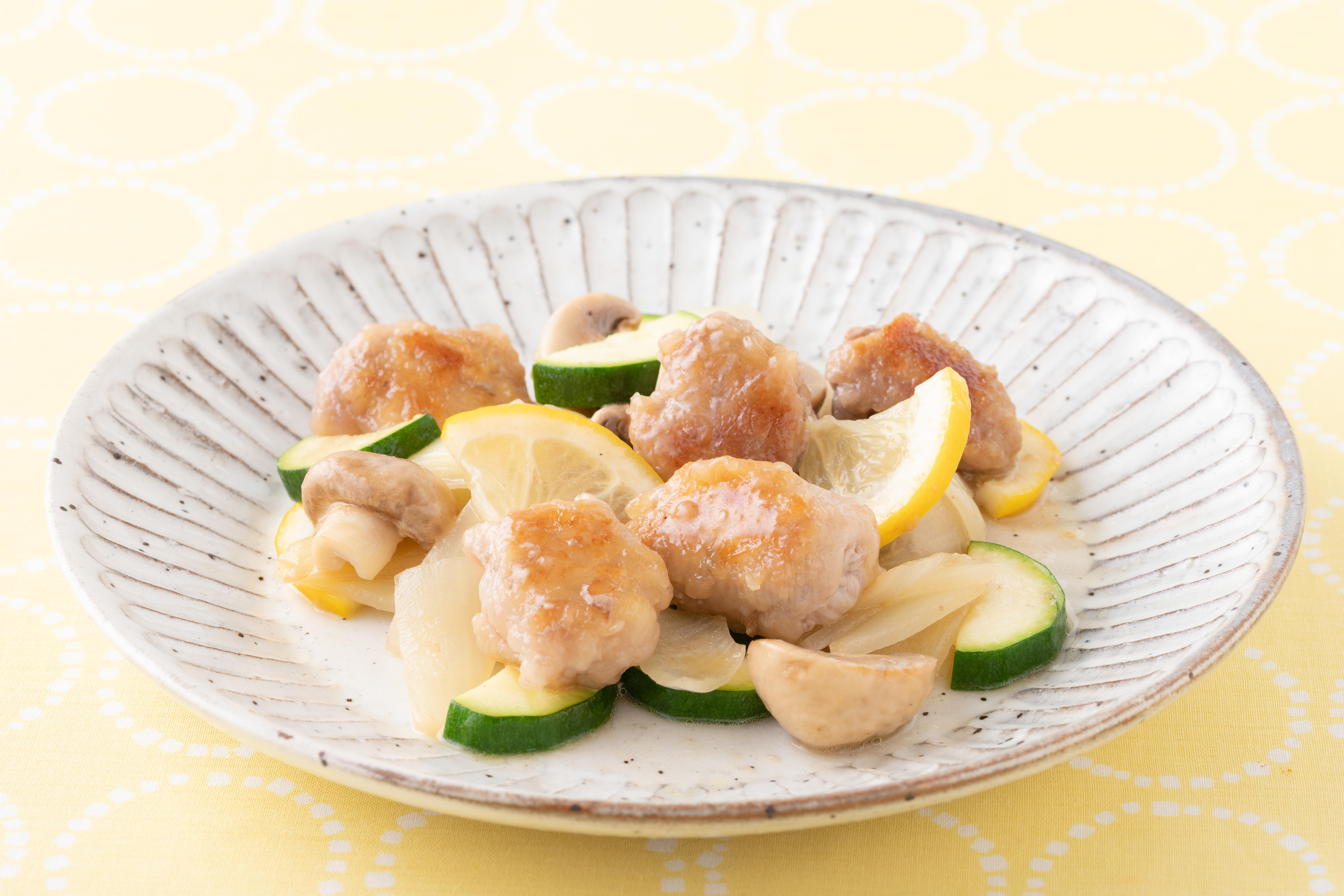 ➊豚もも薄切り肉に下味をしてもみ込み、くるくると丸めておく。ズッキーニを半月切りに、玉ねぎを乱切りに、マッシュルームを半分に切る。レモンは半分をいちょう切りにし、残りを絞る。(レモン汁は大さじ1用意する。足りない場合は液体レモン汁などを足す。)