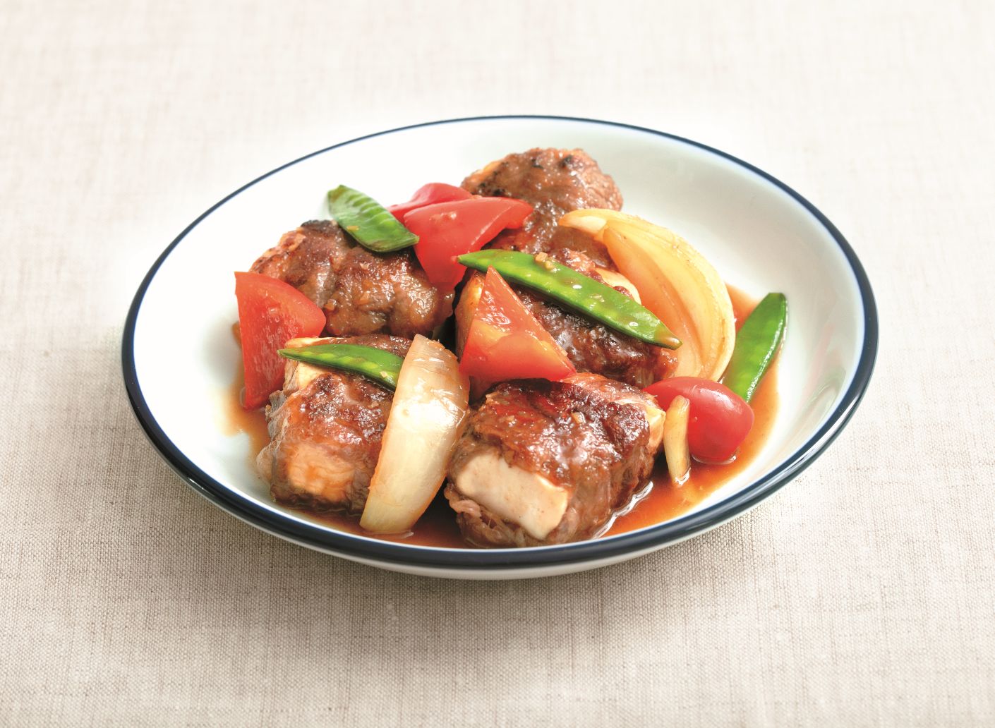 ➌フライパンに小さじ1/2のごま油を入れ、牛肉で巻いた豆腐を焼きつける。周りが固まったらはじに寄せ、残りのごま油を入れ、しょうがを入れて香りが出るまで炒め、玉ねぎ、パプリカ、絹さやを炒め、醤油、オイスターソース、本みりん、水を加え炒めからめる。