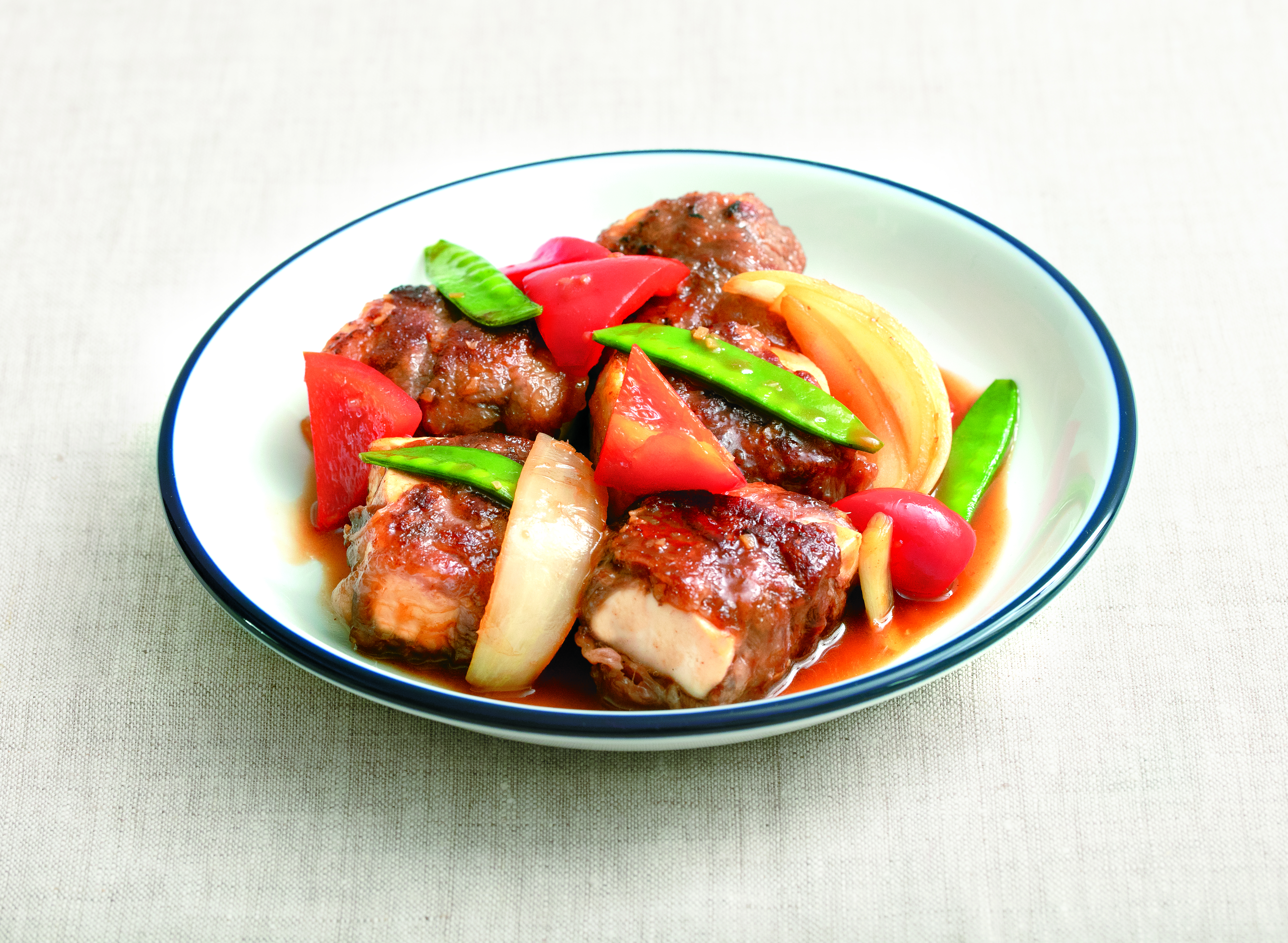 ➌フライパンに小さじ1/2のごま油を入れ、牛肉で巻いた豆腐を焼きつける。周りが固まったらはじに寄せ、残りのごま油を入れ、しょうがを入れて香りが出るまで炒め、玉ねぎ、パプリカ、絹さやを炒め、醤油、オイスターソース、本みりん、水を加え炒めからめる。