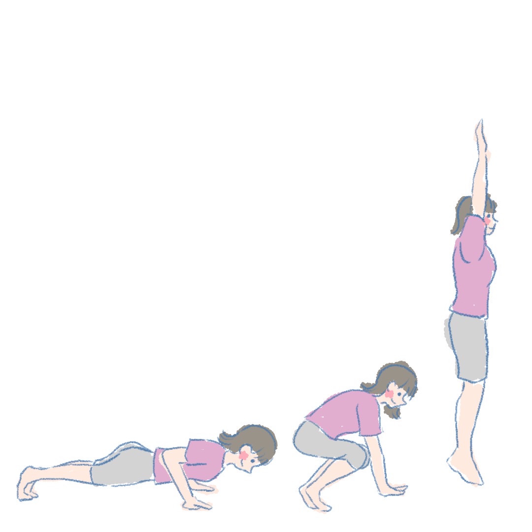 立った状態から腕立て伏せの姿勢になり、立ち上がる流れでジャンプをします。