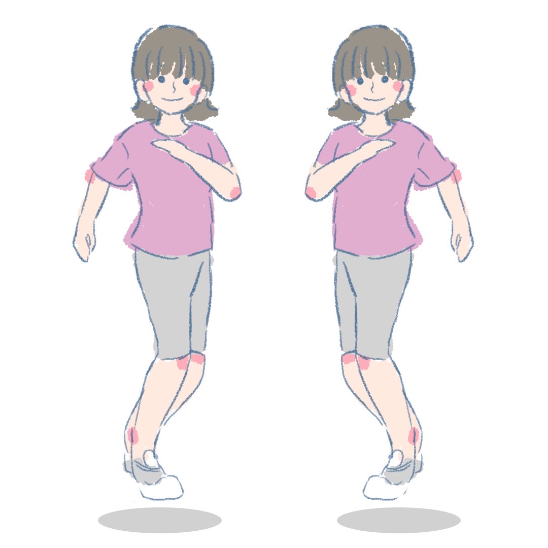 足を揃えて立ち、上半身と下半身を逆方向にひねりながら、軽くジャンプします。