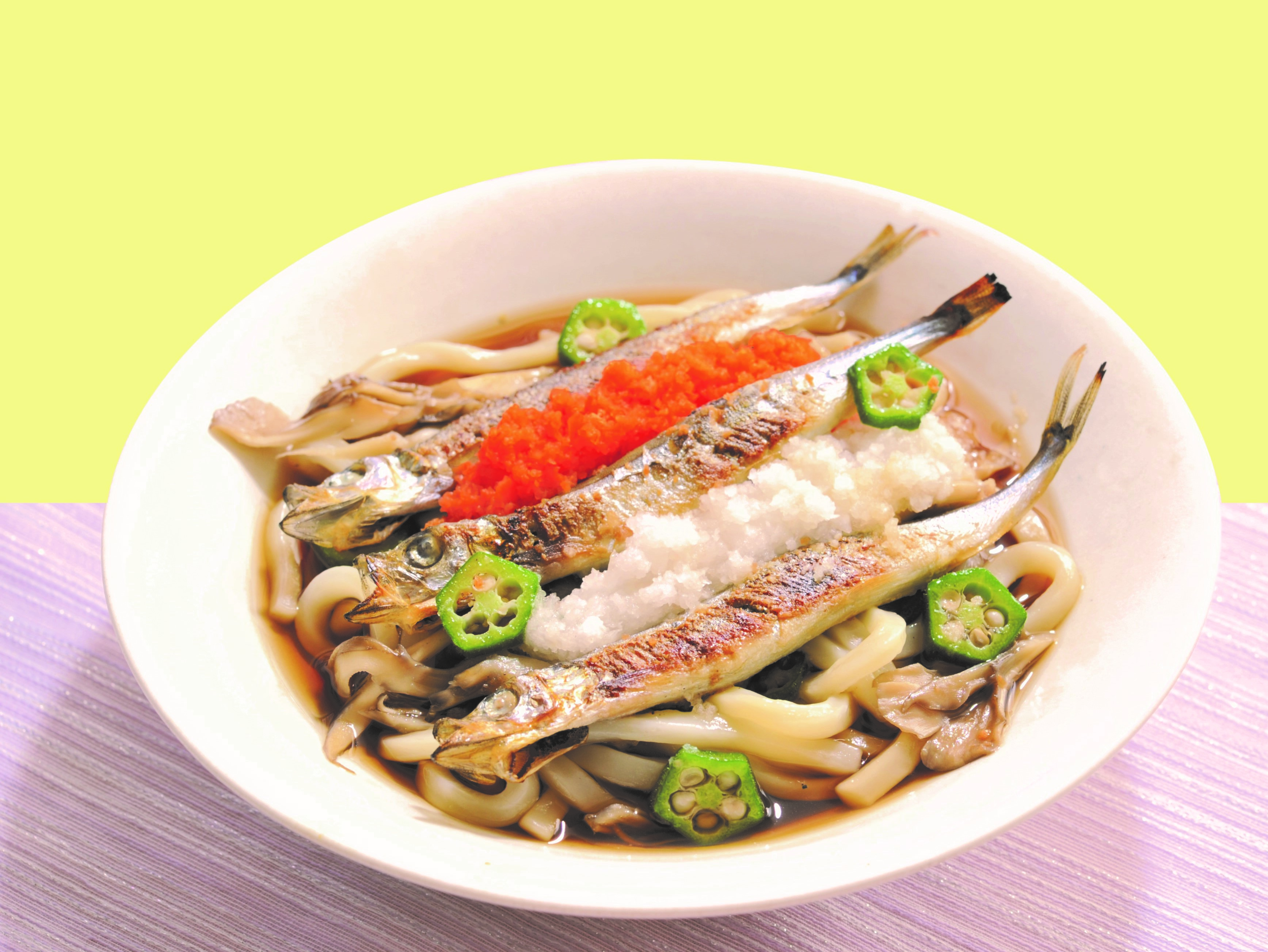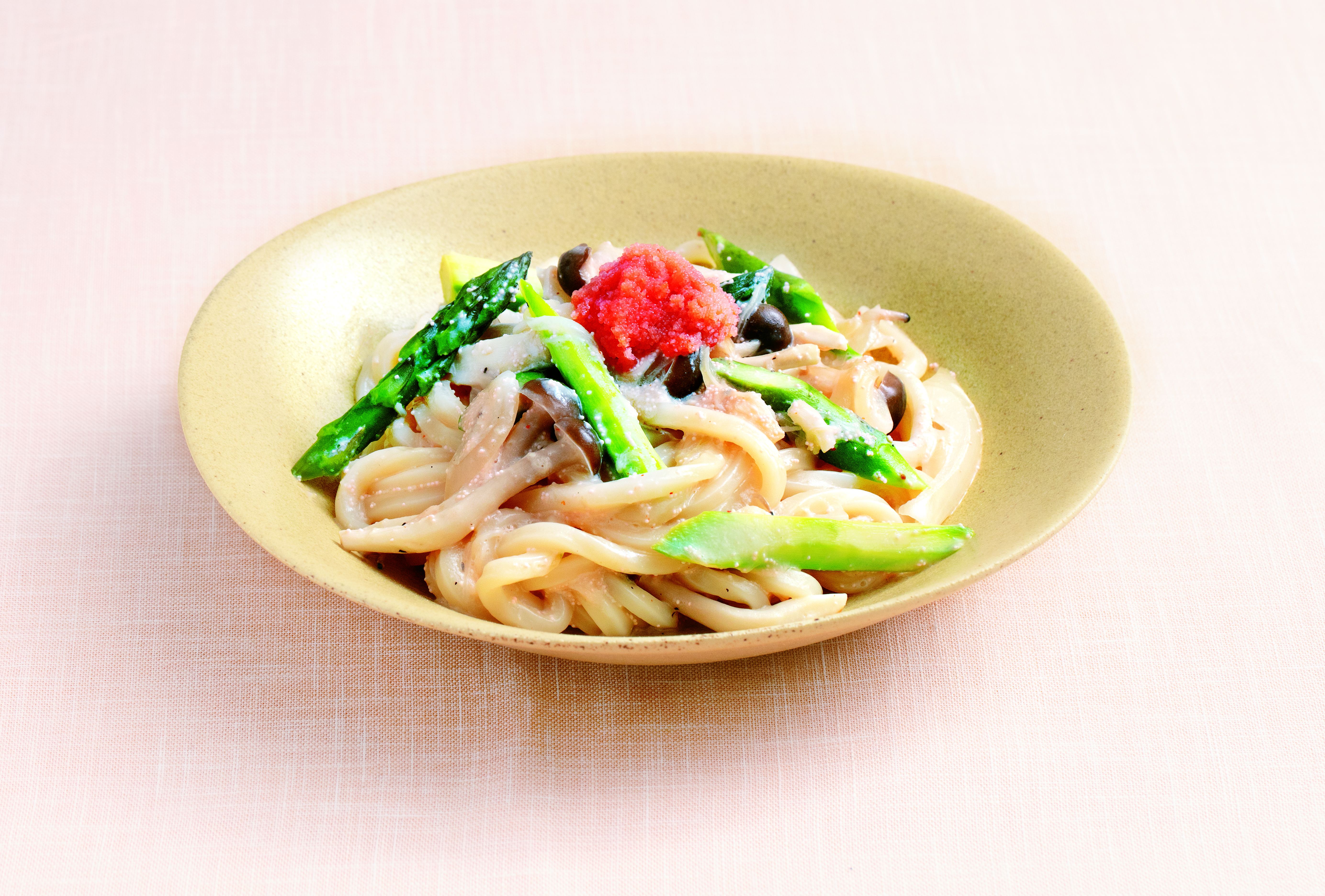 ➋オリーブオイルをフライパンに入れて熱し、玉ねぎとしめじを炒め、豆乳、ホタテ缶を汁ごと入れ加熱。沸騰したらアスパラ、ソース用の明太子、うどんをいれてなじませるように炒め、塩、ブラックペッパーで味を調整し、盛りつけのときにトッピング用の明太子をのせる。