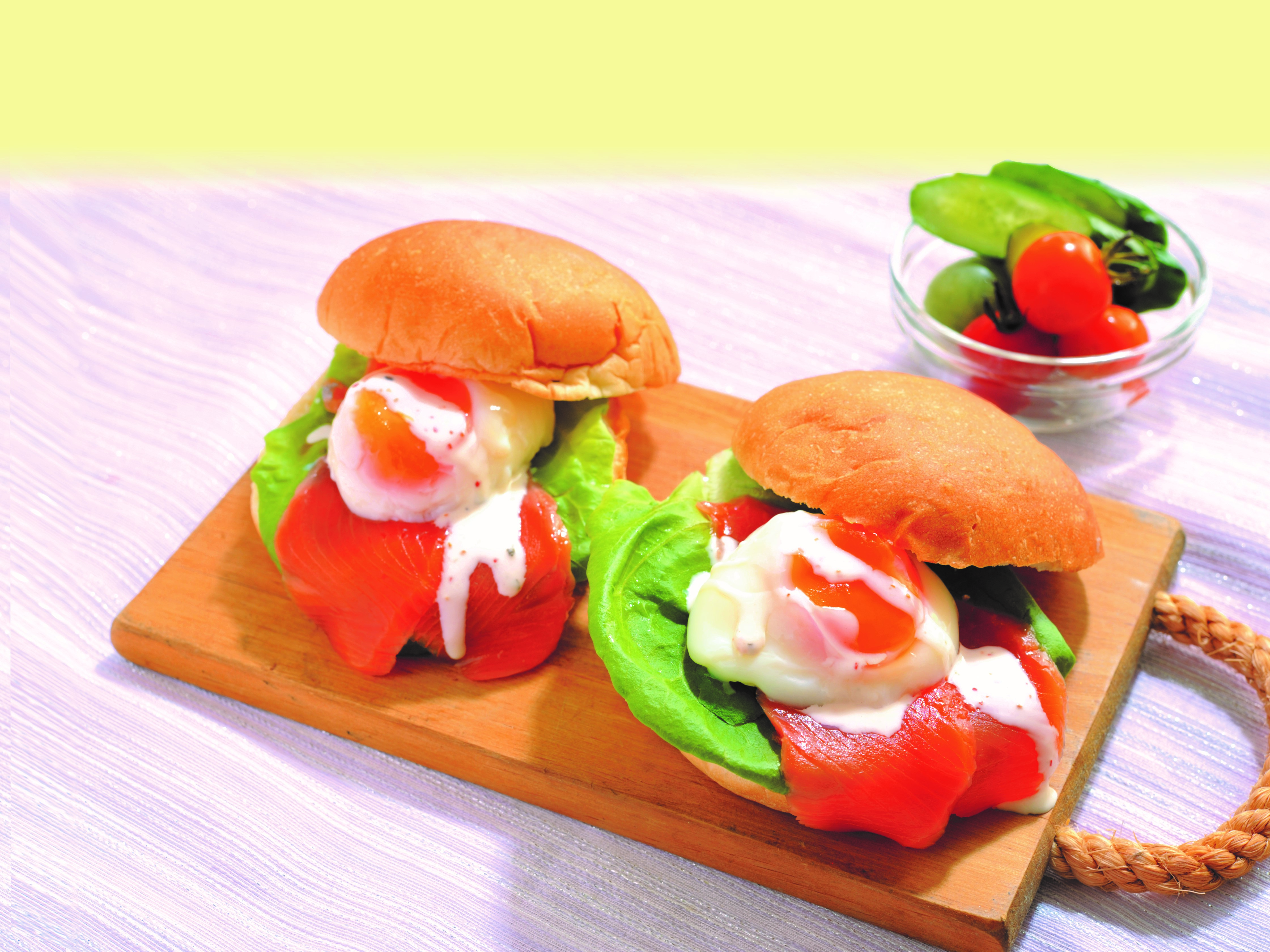 ➌半分に割ったバンズの片方に、サラダ菜、スモークサーモン、ポーチドエッグの順でのせ、➊のソースをかけ、もう片方のバンズを添える。きゅうり、ミニトマトをカットして添える。