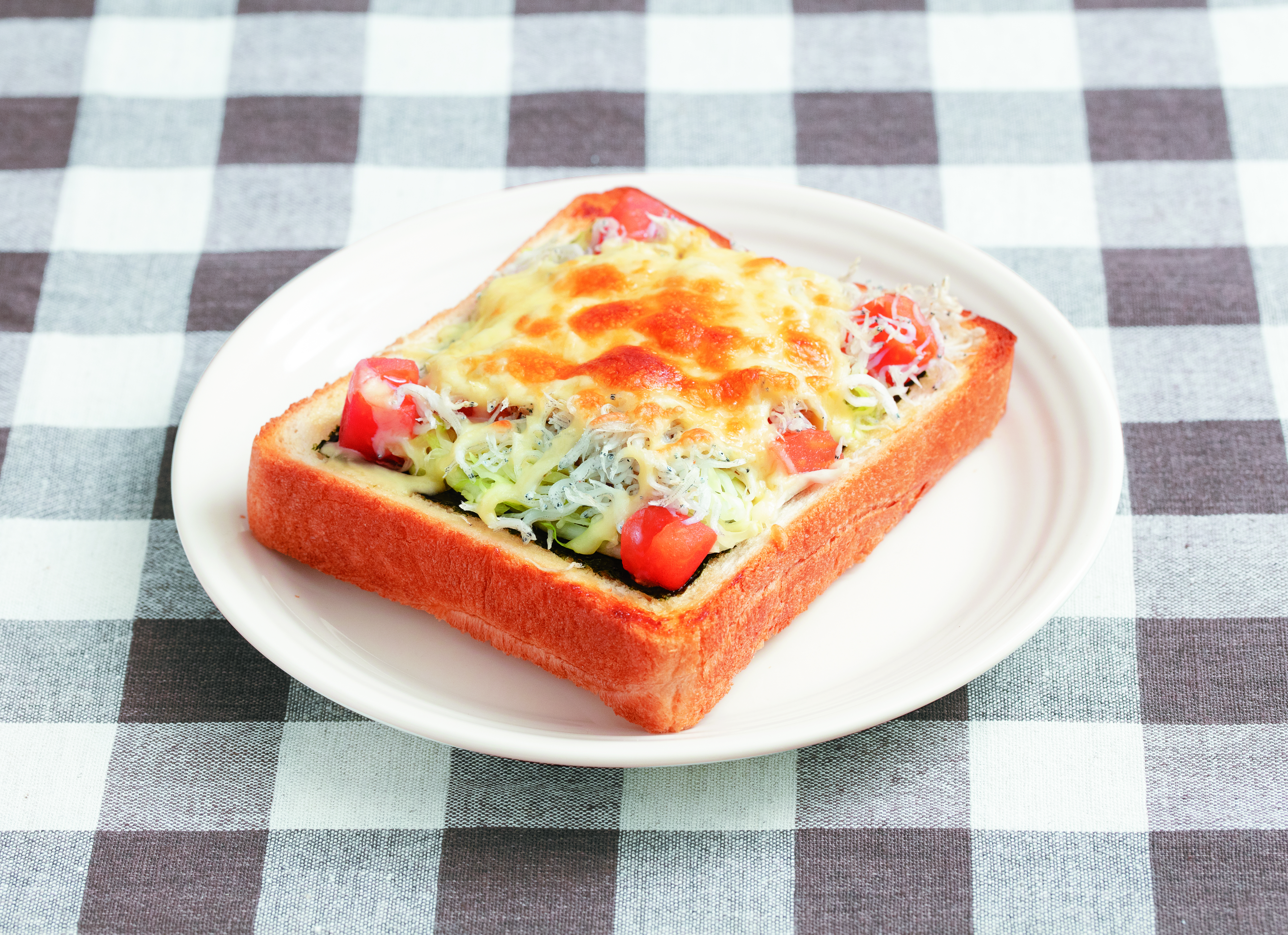➋食パンにマヨネーズを塗って、パンの大きさに切った海苔をのせ、塩もみキャベツ、しらす、トマト、とろけるチーズの順でのせる。