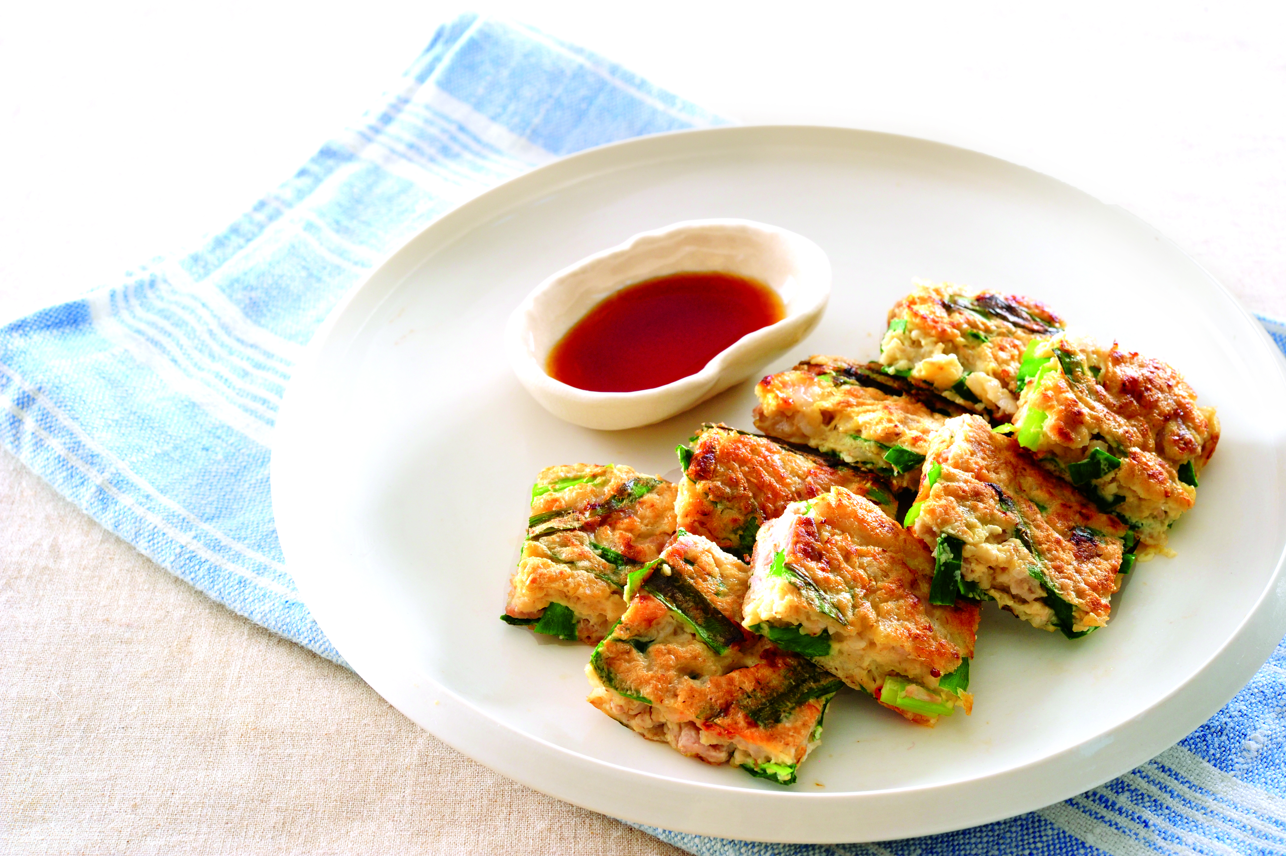 ➌ごま油をフライパンに中火で熱し、②を入れる。3分ほど焼いて焼き目がついたら皿などを使って裏返し、さらに1~2分焼く。食べやすい大きさに切って盛り付け、酢じょうゆを添える。