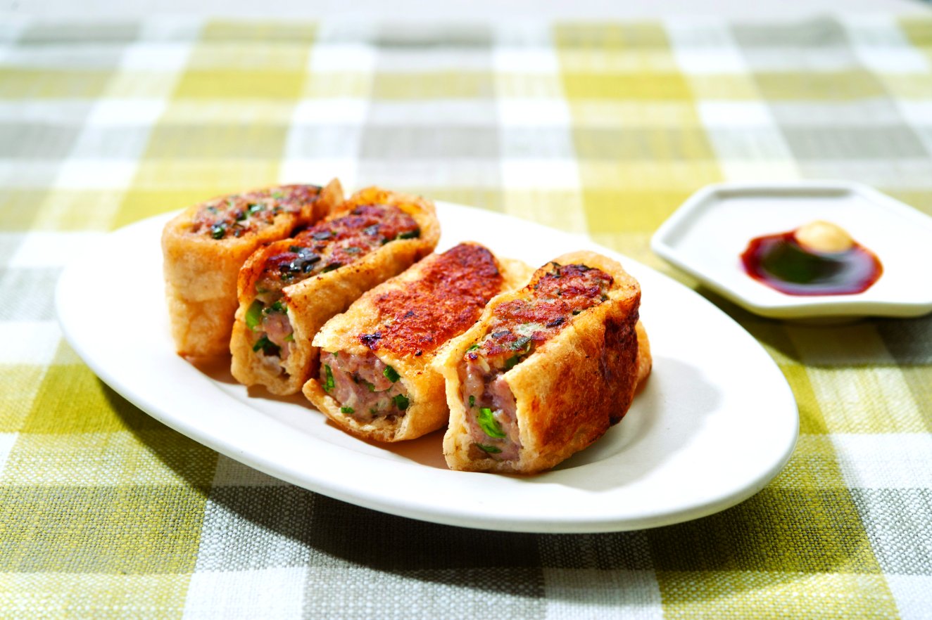 ➊豚ひき肉に[A]、塩、こしょうを加えて練り合わせ、十字に4等分に切った油揚げを開いたものに詰める。