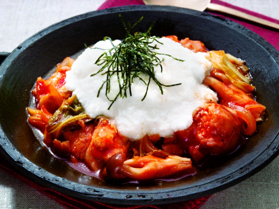 ➌器に盛り、すりおろした山芋、きざみのりを散らす。