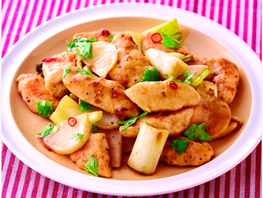 ➊鶏肉はそぎ切りにし、塩、こしょう、片栗粉をまぶす。長ねぎは3cm長さに切る。かぶは根を半分に切りスライスし、茎は3cm長さに切る。