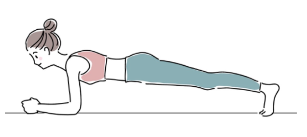 - うつ伏せになった状態で前腕と肘、つま先をつき、その姿勢をキープします。