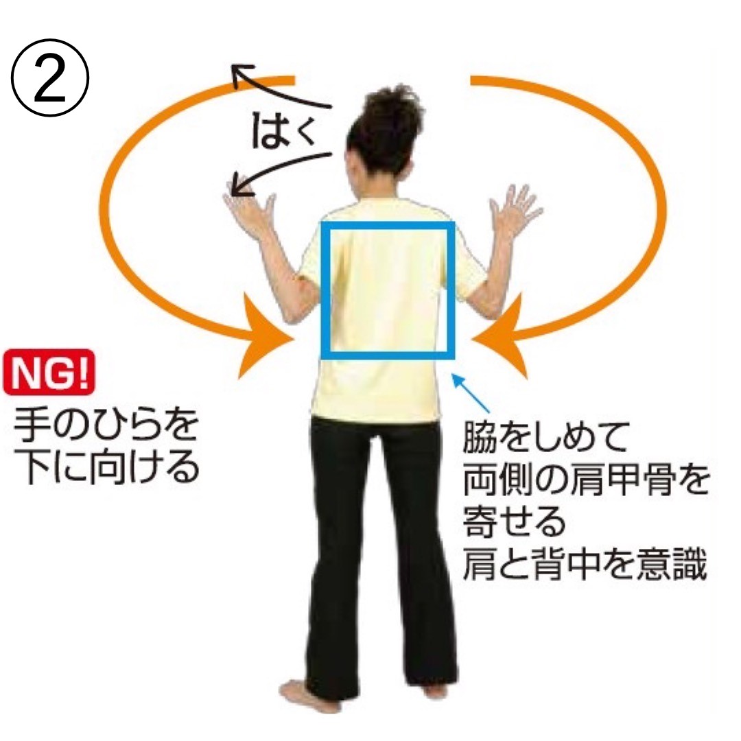 ②息を吐きながらゆっくり5秒かけて、ひじで円を描き下におろします。脇をしめて、両側の肩甲骨を寄せるように動かします。