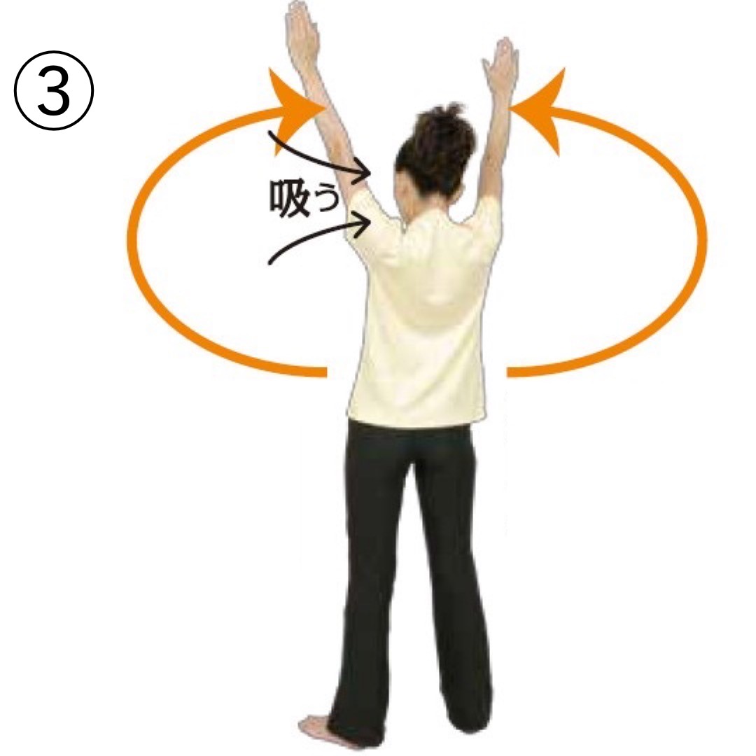 ③息を吸いながらゆっくり5秒かけて円を描くように両手を上に伸ばした元のポーズに戻します。