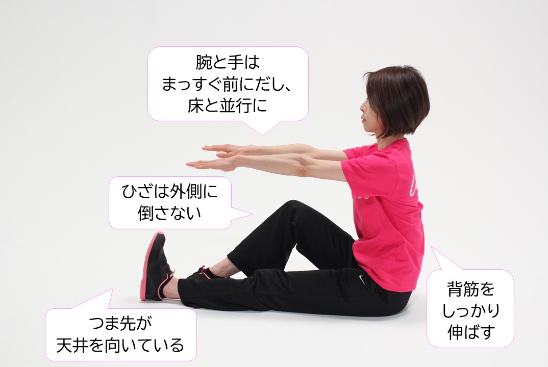 ・脚の裏側と、腰の筋肉をしっかり伸ばすように意識を集中して行いましょう。