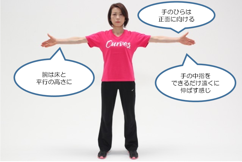 ①肩幅より少し広く足を開き、足先は外側に向けます。両手は横に伸ばしましょう。