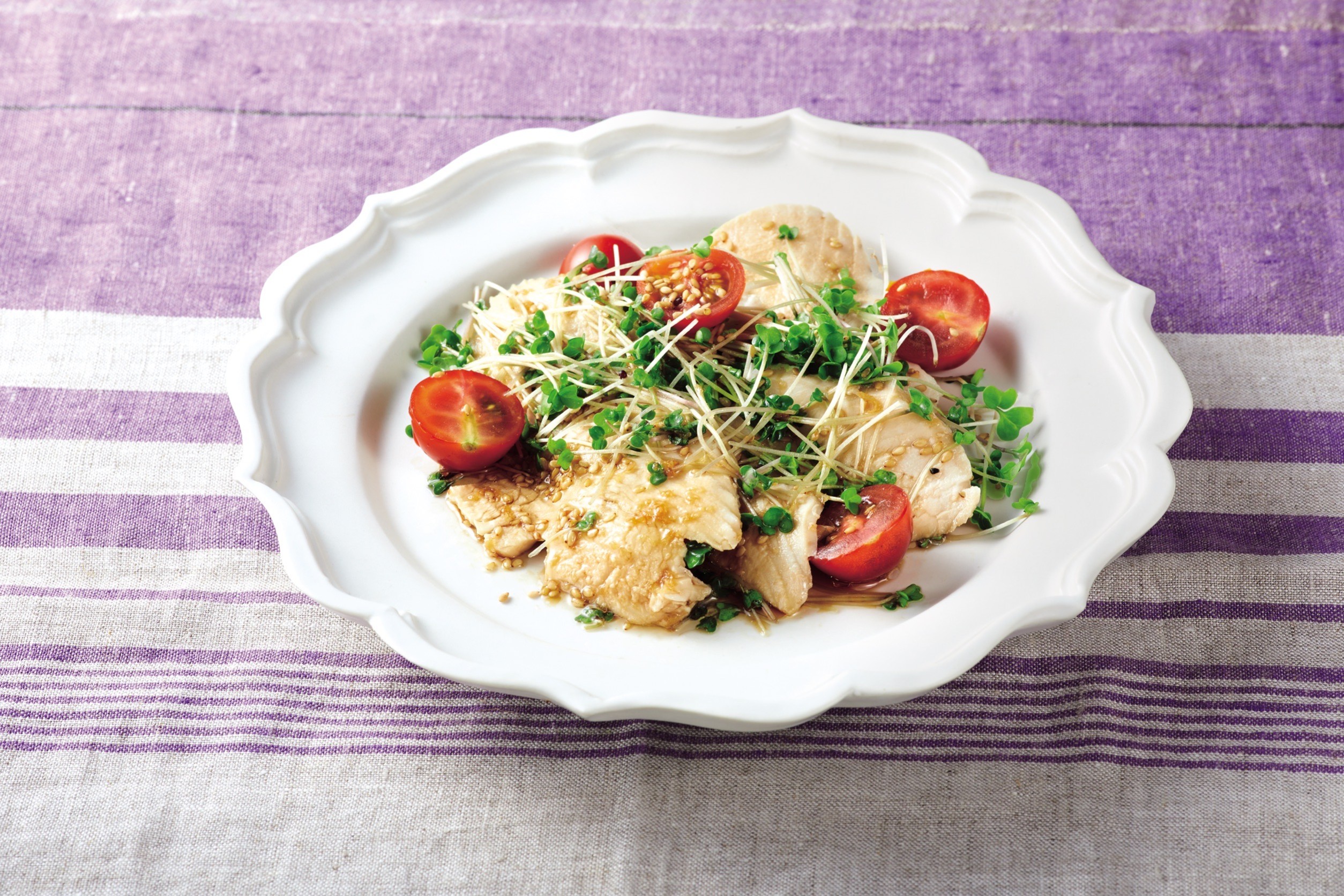 ➌➋をそぎ切りにして器に盛る。根を落としたブロッコリースプラウトとミニトマトをちらし、[B]をかける。