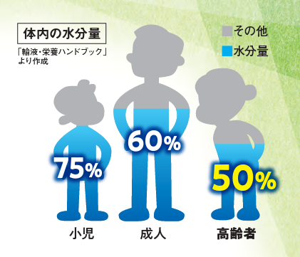 成人の体の約6割は水分で、加齢とともに水分量は少なくなっていきます※1。加齢に伴って筋肉量が減るのが原因です。筋肉のなかには約8割の水分が貯蔵されており、筋肉に蓄えられた水分は、脱水症状や熱中症と深く関係します。汗をかくと血管内の水分が失われます。そのままでは血液の量が減り濃縮されてしまいますが、筋肉に十分な水分があればすぐに血管内の水分は補充されます。筋肉の量が少ないと補給できる水分が不足しやすいため、脱水症状がおこりやすく、重症になりやすくなります。