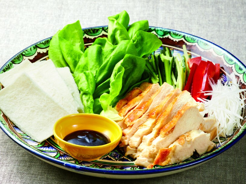 ➌器に➊、➋、きゅうり、パプリカ、ねぎ、サラダ菜を盛る。パンに[A]を塗り、鶏肉と野菜を巻いていただく。