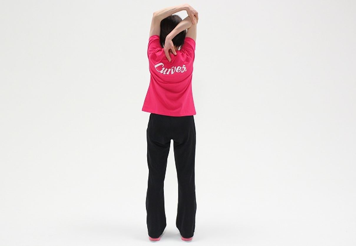足を肩幅に開き、片方のひじをもう片方の手で天井に引き上げるように伸ばします。