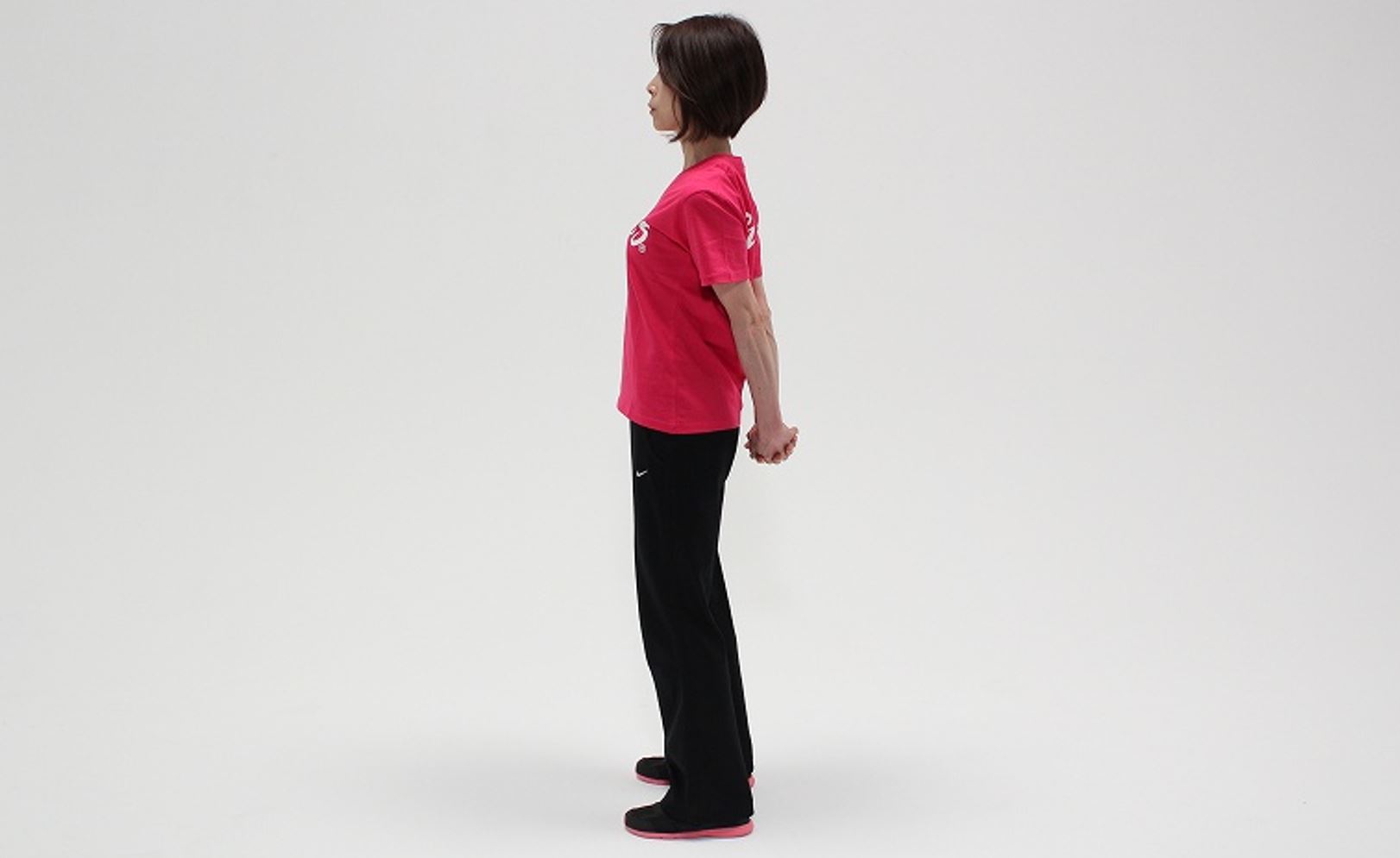 つま先を天井に向け、腕と手をまっすぐ前に出して床と平行に。背筋をしっかり伸ばします。