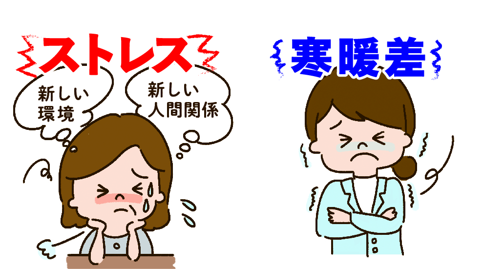職場環境や新しい人間関係、生活リズムなどといった環境の変化によるストレスを受けると交感神経が高くなりやすくなります。また気候の変化や朝晩の寒暖差がある季節は、体が気温に対応するために自律神経自体が疲れてしまい、自律神経が乱れがちになります。