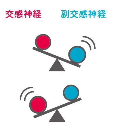 交感神経と副交感神経は、その時の状況に応じて切り替わり、一方が優位に働くと一方が下がるといったシーソーのような関係です、両方がバランスよく働くことでよい体調を維持できます。バランスが乱れ、機能が低下すると「ダルオモ」になったり、体調を崩したりします。
