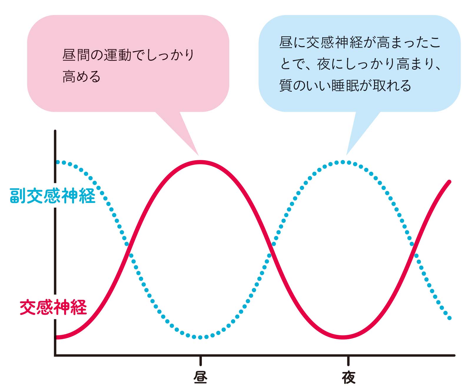 昼の時間帯に筋トレと有酸素運動を交互に行うと、交感神経が健康的に高くなり、夜になったときに副交感神経の働きが高まりやすくなります。自律神経を整えるには、昼に交感神経を高め、夜に副交感神経が高くなるというメリハリが大切です。筋トレと有酸素運動で交感神経を高めることから始めてみるとよいでしょう。